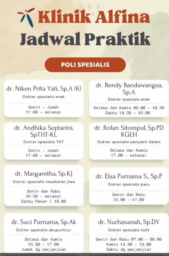 Jadwal dokter di atas dapat berubah sewaktu-waktu, untuk mengetahui jadwal terupdate, anda bisa mengecek di akun instagram resmi klinik Alfina Cilegon berikut ini : https://www.instagram.com/klinik.alfina